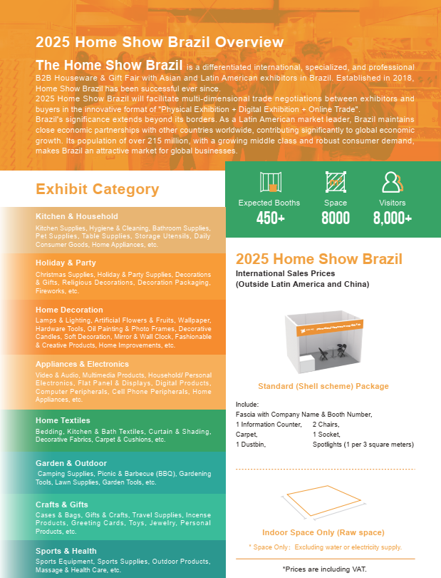 Home Show Brazil là Hội chợ quà tặng và đồ gia dụng B2B quốc tế, chuyên biệt và chuyên nghiệp với các nhà triển lãm Châu Á và Châu Mỹ Latinh tại Brazil, mang đến cơ hội tuyệt vời để gắn kết với các nhà sản xuất đồ gia dụng và quà tặng hàng đầu, các nhà xuất khẩu, nhà nhập khẩu, nhà phân phối và người mua từ khắp nơi trên thế giới.