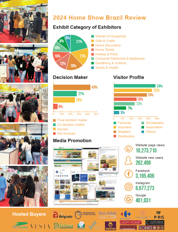 Nơi quy tụ Nhà sản xuất (F0) đầu nguồn, cung cấp sản phẩm Gia dụng và Quà tặng trong nước và quốc tế, với 08 ngành hàng chính Home Show Brazil được tổ chức theo định dạng sáng tạo “Triển lãm thực tế + Triển lãm kỹ thuật số + Thương mại trực tuyến”, tạo điều kiện thuận lợi cho các cuộc đàm phán thương mại giữa các nhà triển lãm và người mua theo nhiều chiều hướng.